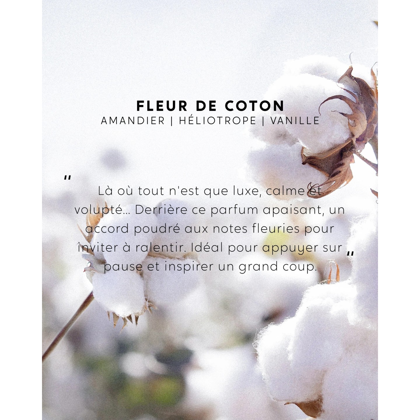 Il suffit d’un pschitt pour que notre spray parfumé Fleur de Coton diffuse instantanément un parfum durable. Un parfum apaisant, aux notes poudrées et fleuries pour inviter à ralentir. Profitez jusqu’à 4 semaines de bonheur parfumé.