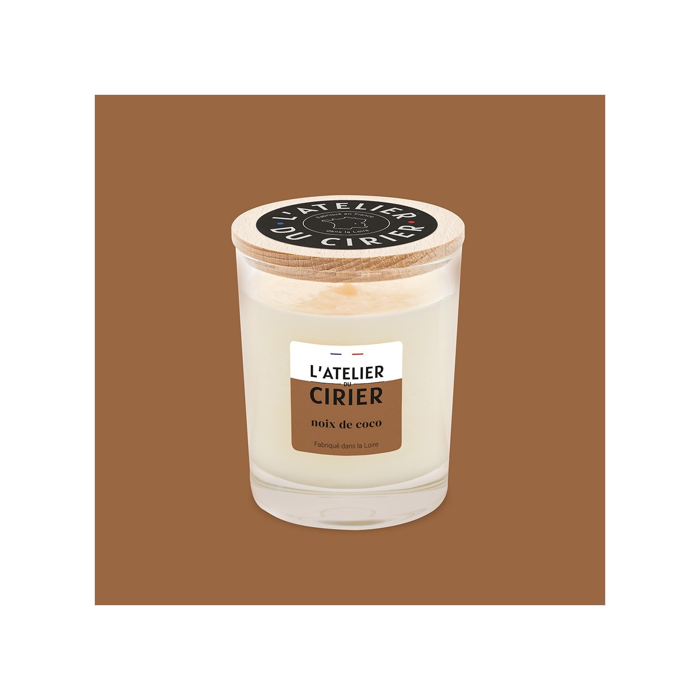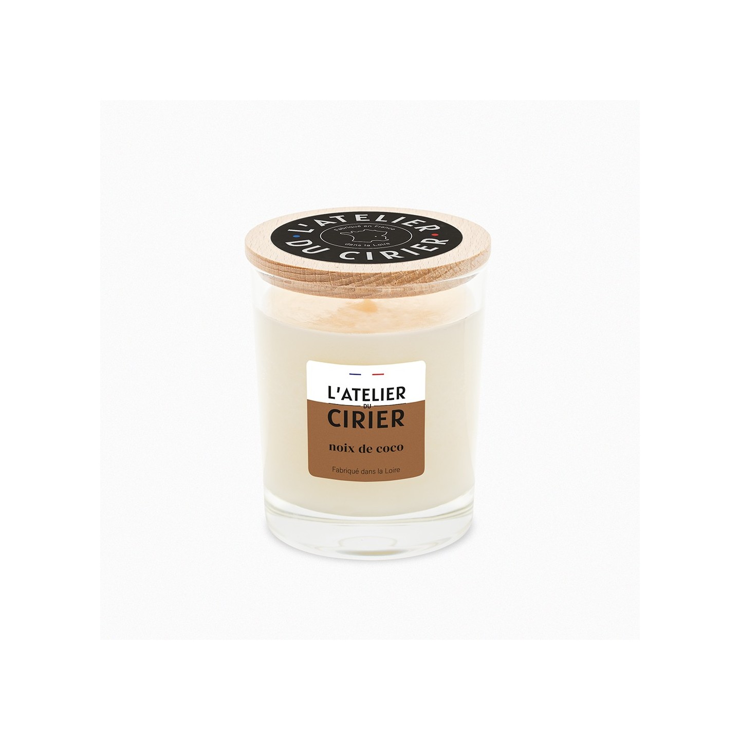 Les bougies 175g ont un couvercle en bois et une étiquette colorée : un mariage indémodable pour une gamme intemporelle et authentique.