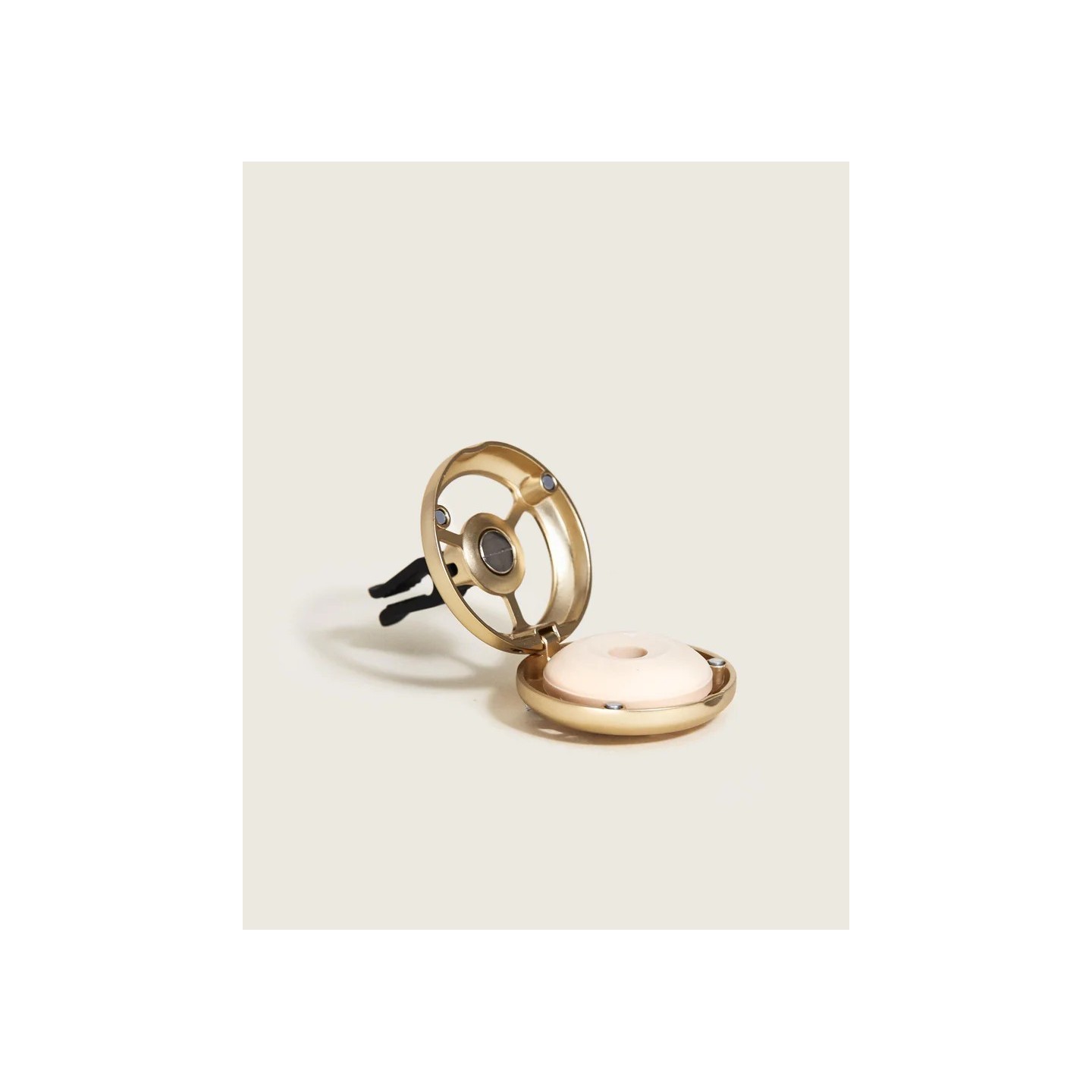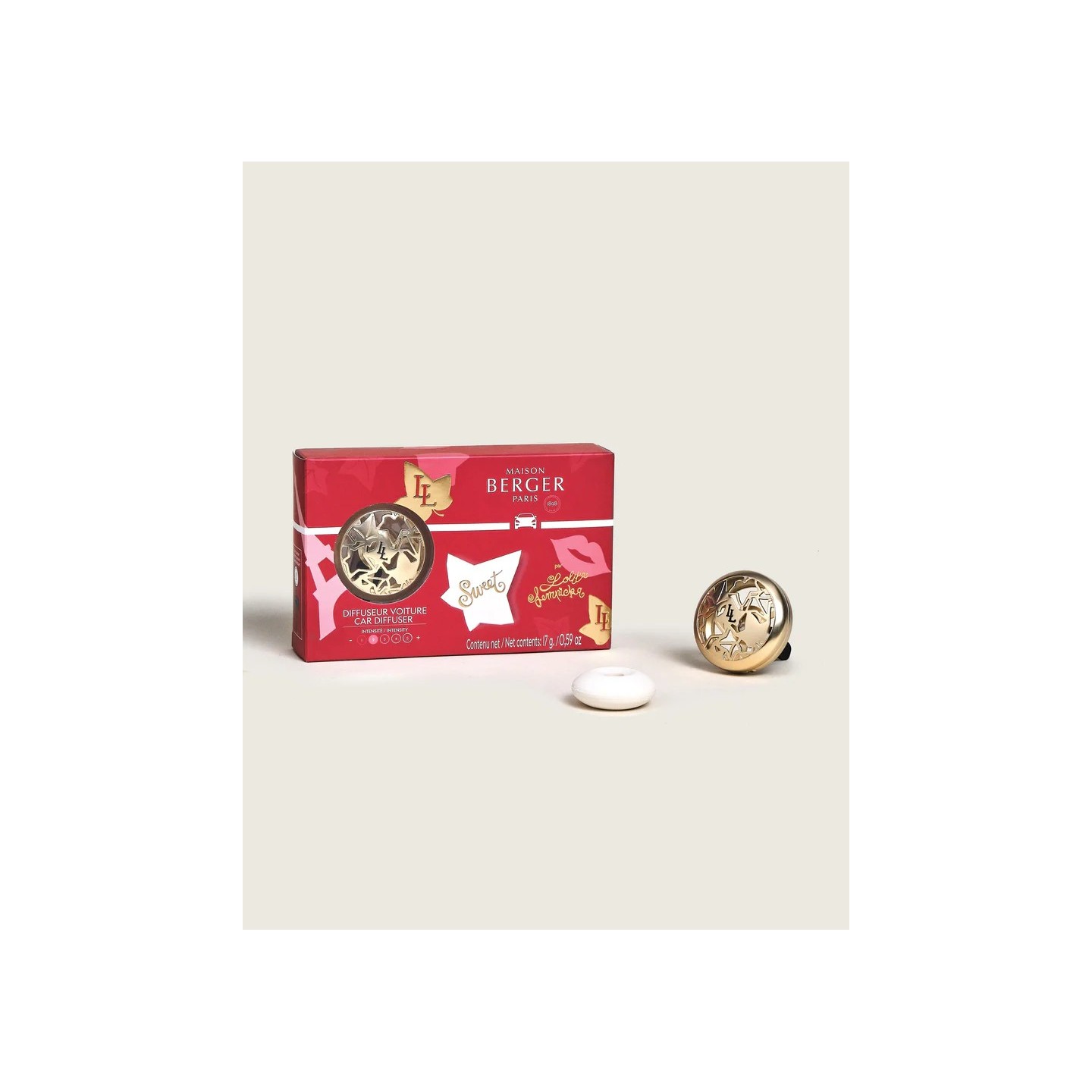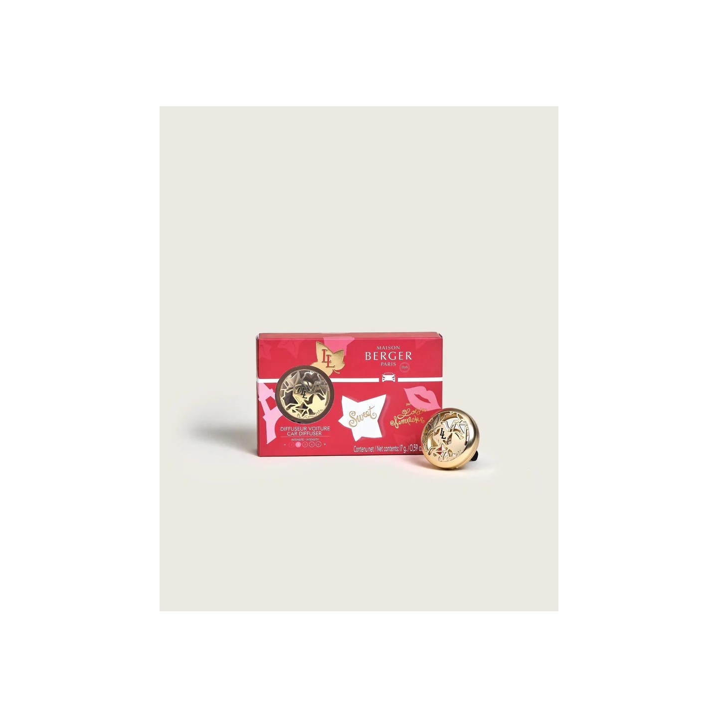 Embarquez pour un voyage olfactif avec ce diffuseur voiture doré, sublimé par le parfum Lolita Lempicka Sweet aux notes de cerise, framboise et praline.